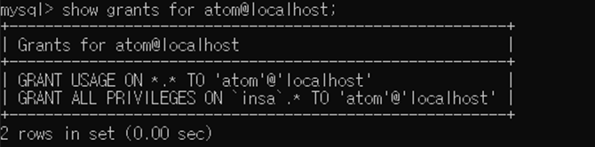 mysql> grant all privileges on insa.* to atom@'localhost' identified by '1234';