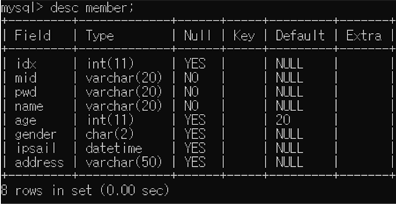 테이블의 구조를 보기위해서는 use mysql 먼저 실행 후 진행해야 한다.