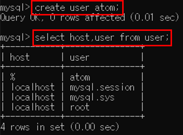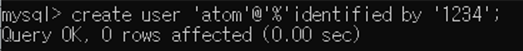 mysql> create user 'atom'@'%'identified by '1234'; [% -> 외부에서 접속가능]